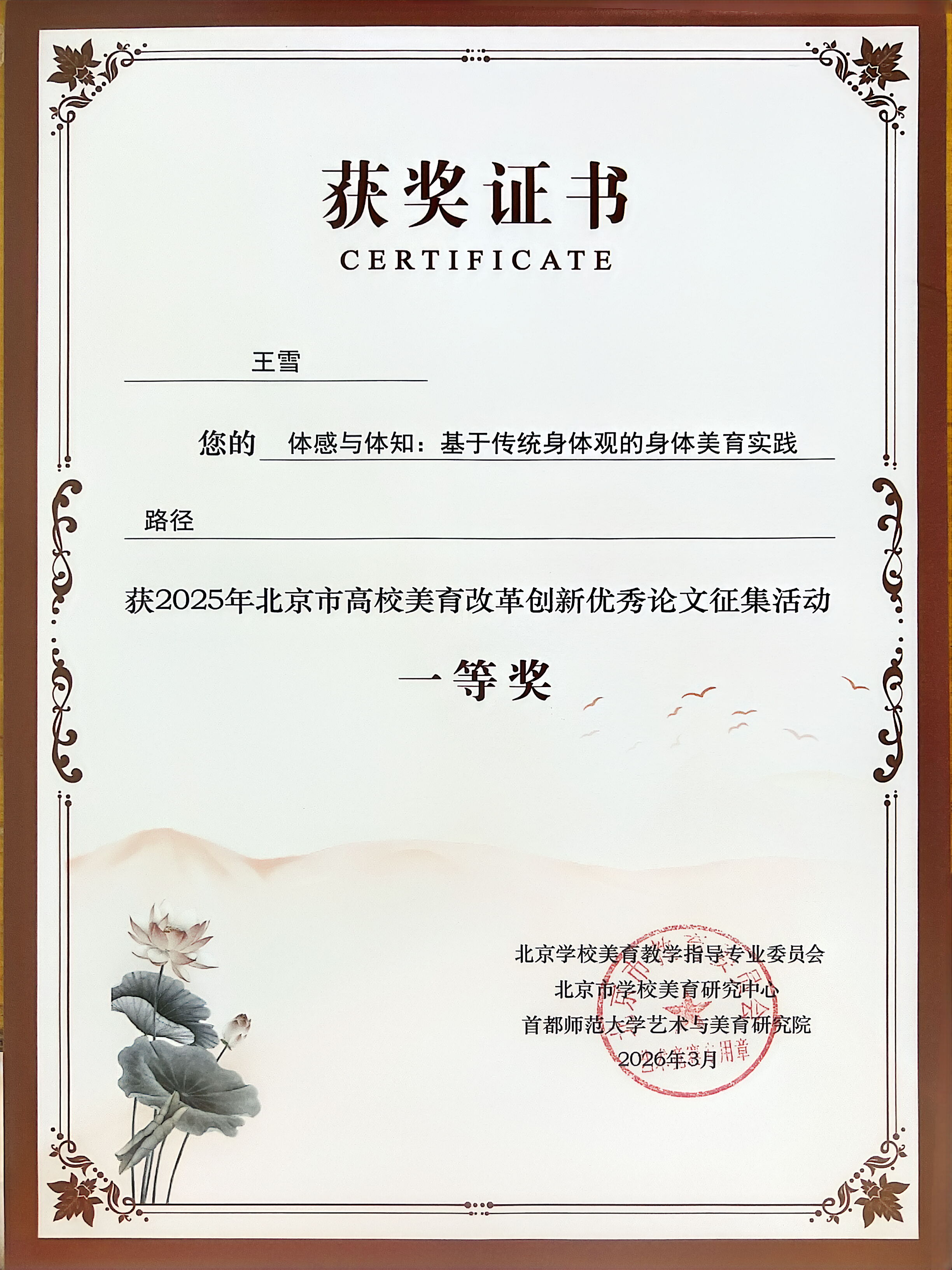 为贯彻落实《教育部关于全面实施学校美育浸润行动的通知》和《中共中央办公厅 北京市人民政府办公厅关于全面加强和改进新时代学校美育工作的行动方案》的精神,不断深化北京市学校美育工作改革实践、提高北京市学校美育科研水平,北京市教委开展了2025年北京市高校美育科研论文征集评选活动,共征集论文192篇。我院基础教学部王雪老师的论文《体感与体知:基于传统身体观的身体美育实践路径》获评一等奖。